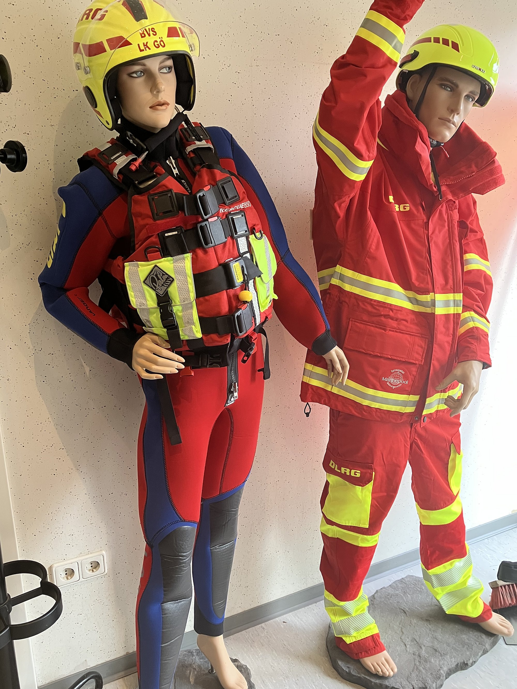 Die beiden noch namenlosen Modepuppen stehen im Eingangsbereich unseres Vereinszentrum und tragen das Outfit eines Strömungsretters bei uns. Das soll nach Aussage von David Richter nicht nur gut aussehen, sondern soll Besuchern des Hauses Lust auf Mitmachen im Bevölkerungsschutz machen.